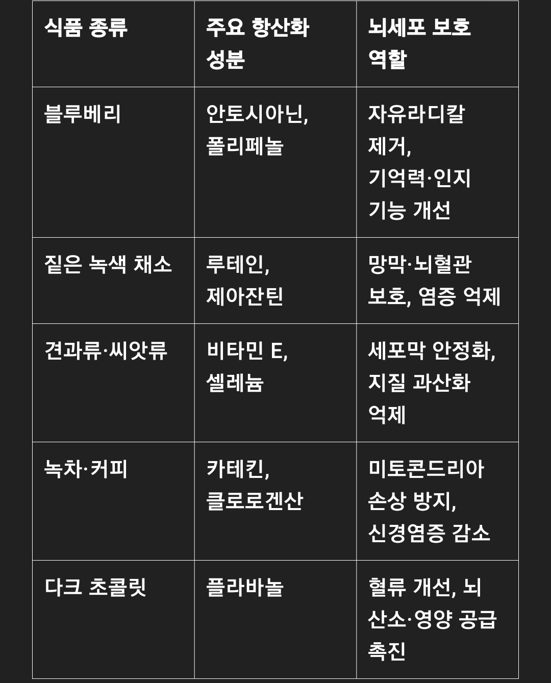 항산화 식품의 플라바놀(다크 초콜릿), 폴리페놀(녹차) 등은 내피세포의 산화 스트레스를 줄여 혈관 건강을 유지하고, 미토콘드리아 기능을 보호해 뇌세포의 에너지 생성 효율을 높여줍니다.
