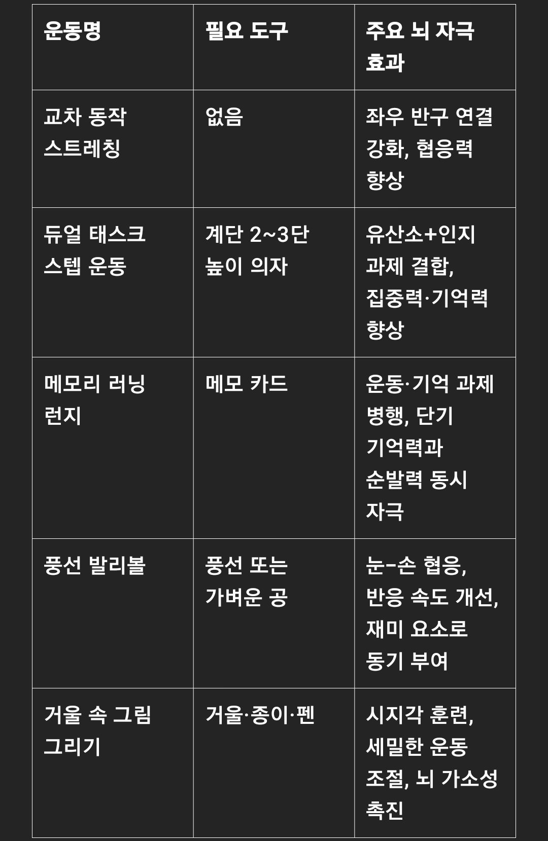 실내에서도 손쉽게 할 수 있는 뇌 자극 운동 5가지를 정리했습니다. 표, 소개, 실제 사례, 주의사항까지 모두 담았으니 편하게 확인해 보시고, 더 보완하실 부분이 있으면 알려주세요!