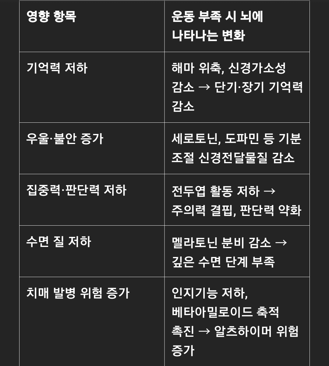 운동 부족은 단순히 체력이 떨어지고 체중이 느는 문제가 아닙니다. 우리 뇌의 구조와 기능에도 깊은 영향을 주며, 이는 결국 집중력 저하, 기억력 감퇴, 감정 기복의 심화, 그리고 장기적으로는 치매의 위험까지도 증가시킬 수 있습니다.
