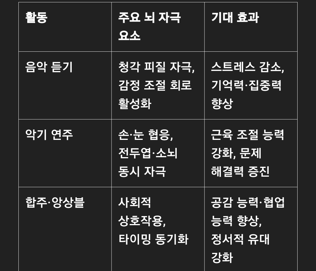 호흡·발성 조절: 관악기·성악의 경우, 호흡 조절이 전두엽 및 뇌간을 자극해 자율신경계 균형을 돕습니다.