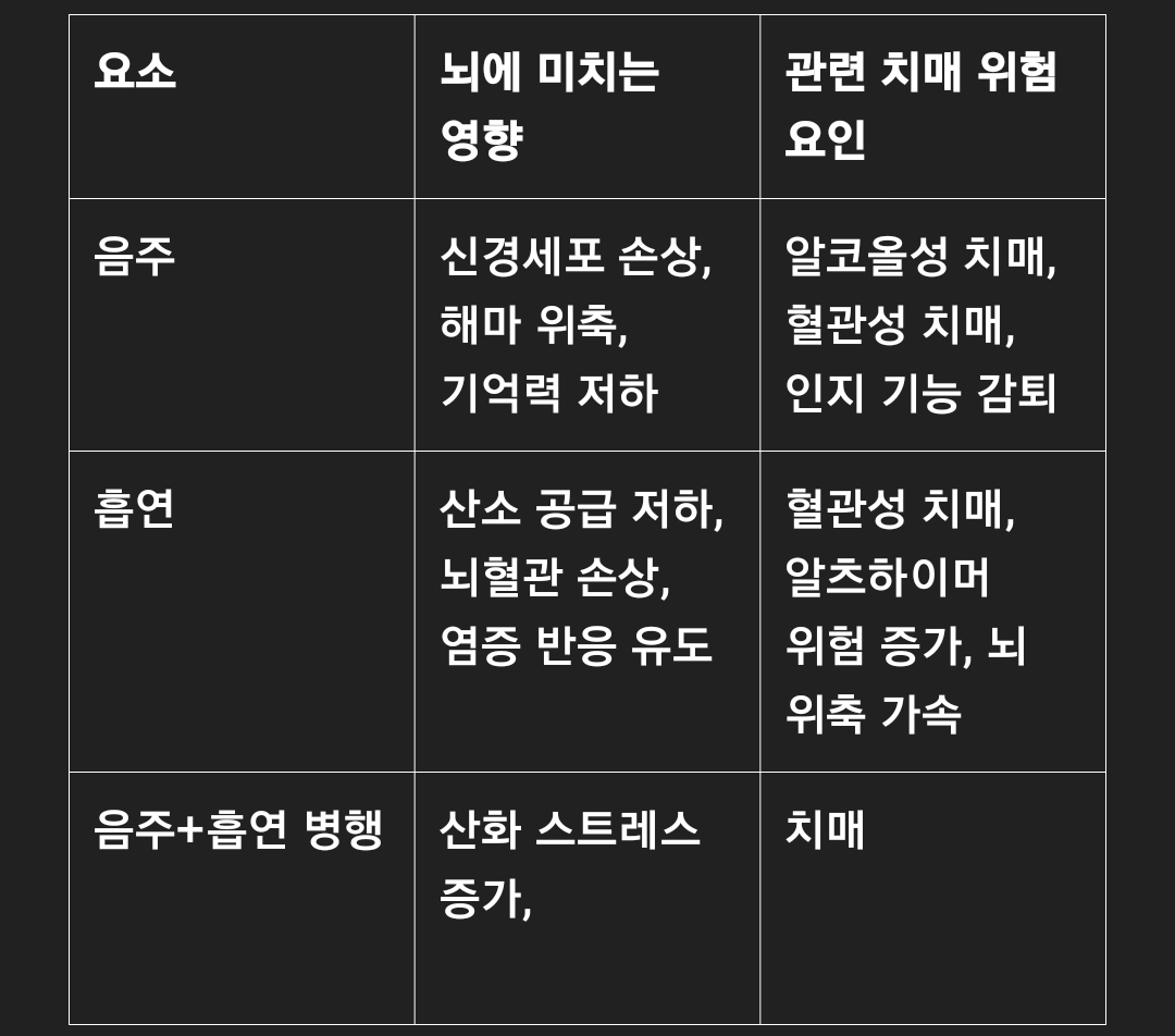 술과 담배를 동시에 오래 즐기는 습관은 단독 행동보다 더 심각한 뇌 손상을 유발합니다.
