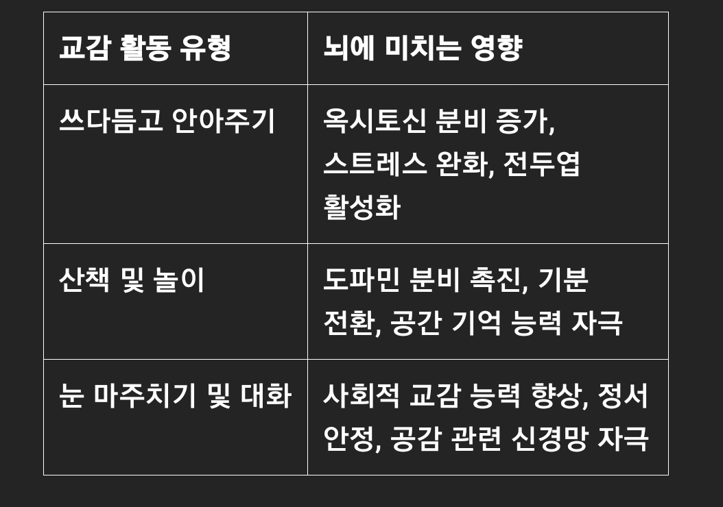반려동물과의 교감은 단순한 감정적 위로를 넘어, 뇌과학적 측면에서 실질적인 기능 향상과 안정 작용을 가져오는 활동입니다. 옥시토신과 도파민 분비, 인지 기능 유지, 사회적 교감 능력 향상, 수면 질 개선 등 다양한 방식으로 뇌의 여러 영역이 자극되고 회복됩니다.