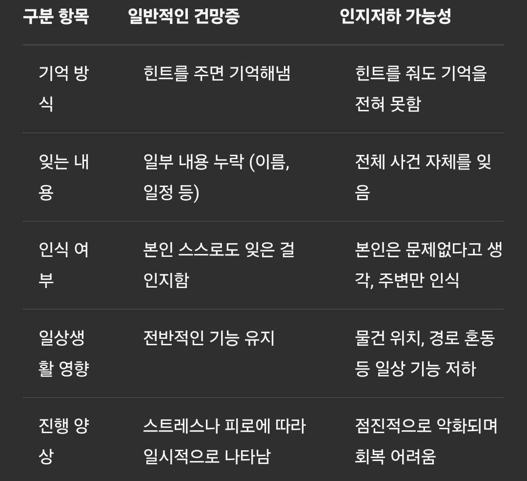 무엇보다 중요한 차이점은, 힌트를 주어도 기억을 못 하고, 본인은 전혀 문제를 느끼지 못하는 경우가 많다는 점입니다. 오히려 주변에서 먼저 ‘무언가 이상하다’고 느끼고 병원을 찾게 되는 경우가 많습니다.