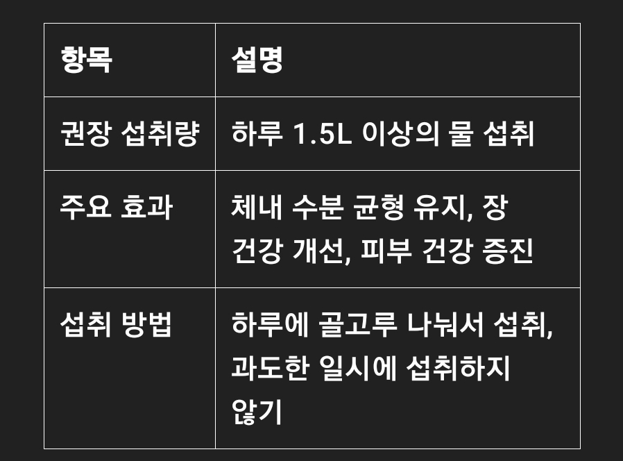 물은 체내 수분 균형을 유지하고, 세포의 정상적인 기능을 돕고, 장 건강을 증진시키며, 피부 건강과 체온 조절에까지 영향을 미칩니다. 하루 1.5L 이상의 물을 꾸준히 섭취하면, 소화 기능 개선, 피로 회복, 몸의 독소 배출에 긍정적인 효과를 가져옵니다. 특히 물 섭취가 부족하면 탈수 증상이 발생할 수 있으며, 이는 건강 문제를 일으킬 수 있습니다.