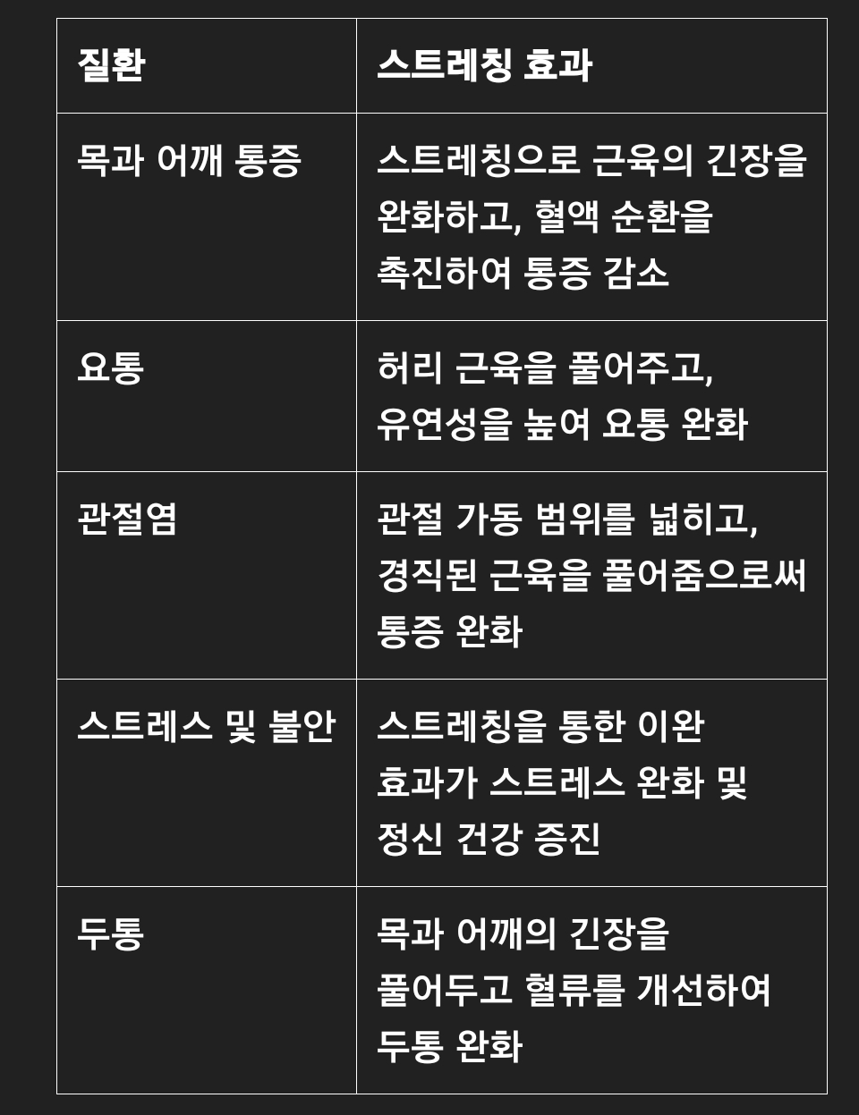 스트레칭은 여러 질환을 개선하는 데 매우 효과적인 방법입니다. 목 통증, 요통, 관절염, 스트레스 및 두통 등의 신체적 문제를 스트레칭만으로도 상당히 완화할 수 있습니다. 일상 속에서 짧은 시간이라도 꾸준히 스트레칭을 실천하는 것만으로, 건강을 크게 개선할 수 있습니다.