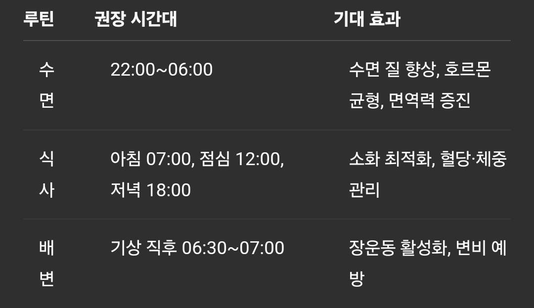 매일 일정한 수면·식사·배변 루틴을 구축하면 생체리듬이 최적화되어 대사, 소화, 수면 질, 장 건강이 개선됩니다. 작은 습관 변화를 꾸준히 실천해, 건강한 일상을 되찾아보세요.