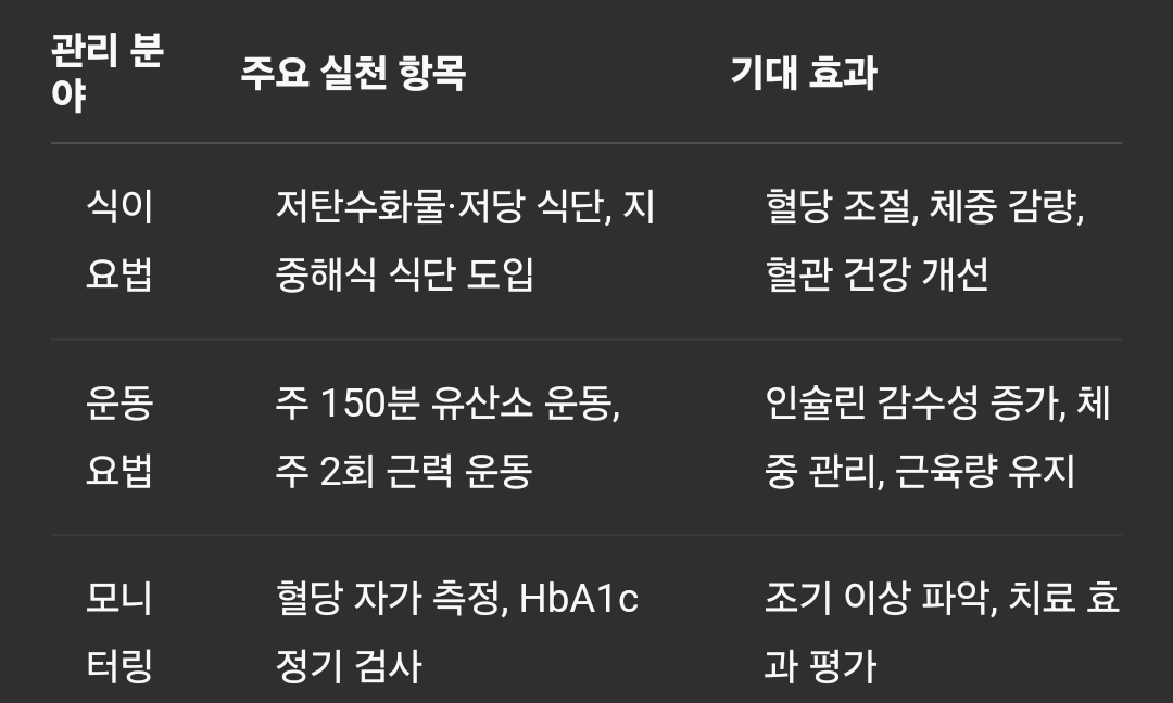 이 문서에서는 당뇨병 초기 관리의 세 가지 핵심 분야—식이요법, 운동요법, 혈당 모니터링—에 대해 구체적 실천 방법과 효과, 그리고 실제 사례