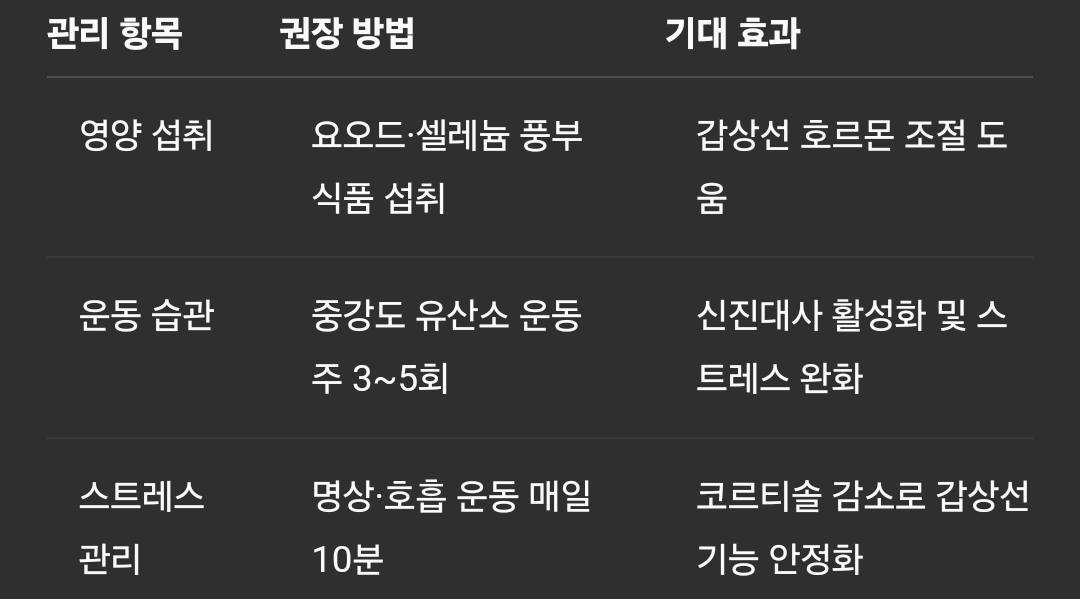 갑상선 건강은 단일 요인보다 영양, 운동, 수면, 스트레스 관리, 환경 요인 등 여러 생활 습관의 균형을 통해 지킬 수 있습니다. 위에서 제시한 관리법을 일상에 접목하여 꾸준히 실천하신다면, 갑상선 기능 이상으로 인한 증상을 예방하고 전반적인 삶의 질을 향상시킬 수 있을 것입니다.