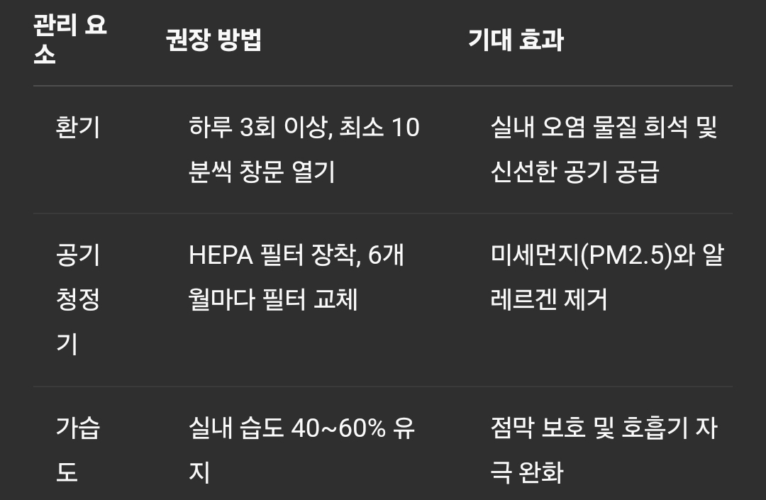 가습도 실내 습도 40~60% 유지 점막 보호 및 호흡기 자극 완화