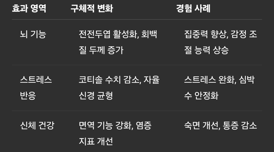 뇌 기능 전전두엽 활성화, 회백질 두께 증가 집중력 향상, 감정 조절 능력 상승