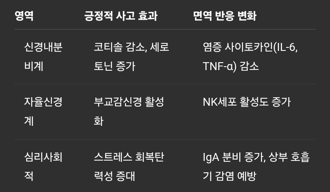 행복감과 유대감을 촉진하는 세로토닌과 옥시토신이 증가하며, 이들 호르몬은 면역세포 수용체에 작용하여 NK세포, T세포 기능을 강화합니다.