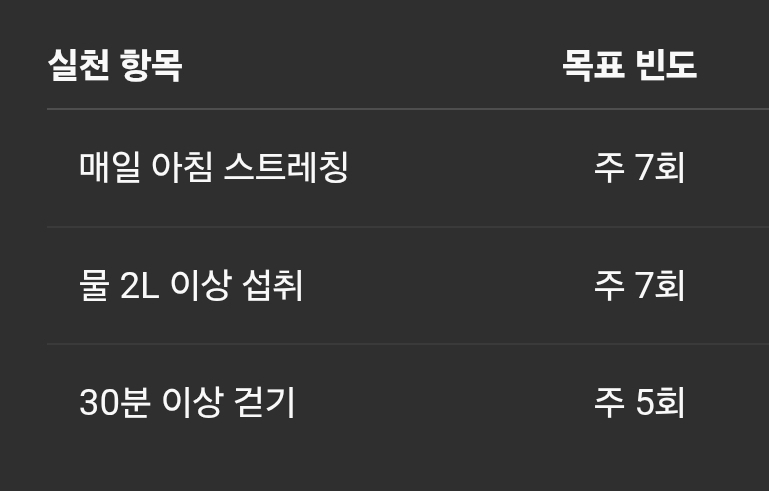 2. 주간 계획: 매주 일요일 실천 항목과 빈도를 설정.
