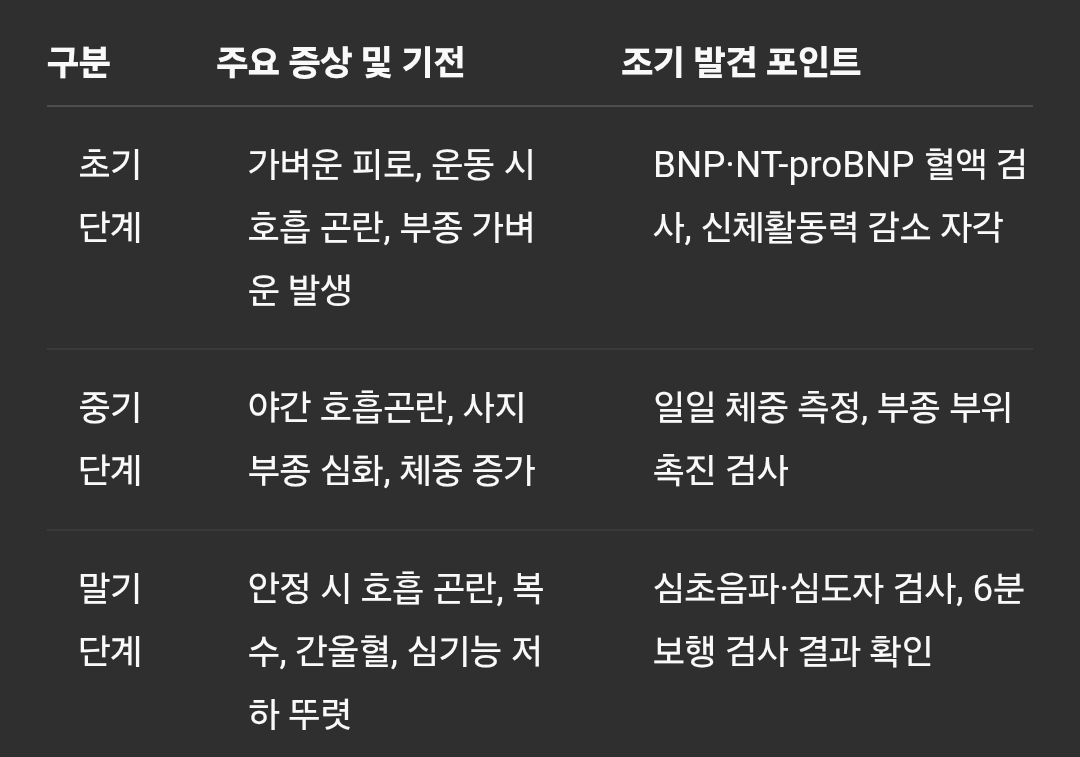 초기 단계 가벼운 피로, 운동 시 호흡 곤란, 부종 가벼운 발생 BNP·NT-proBNP 혈액 검사, 신체활동력 감소 자각