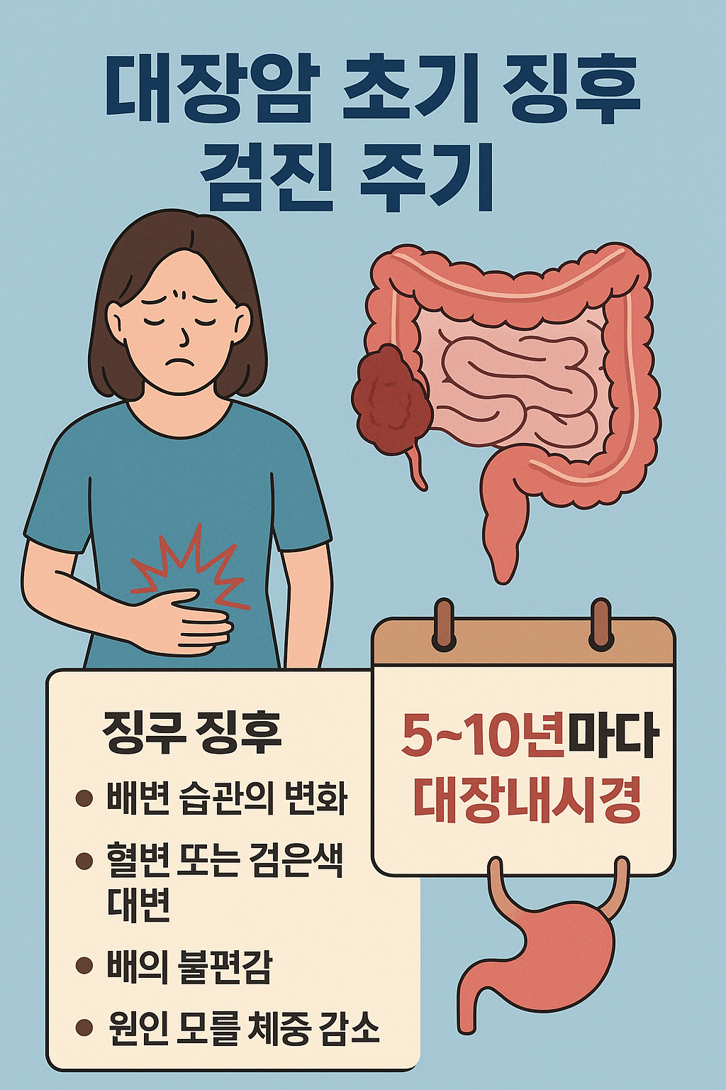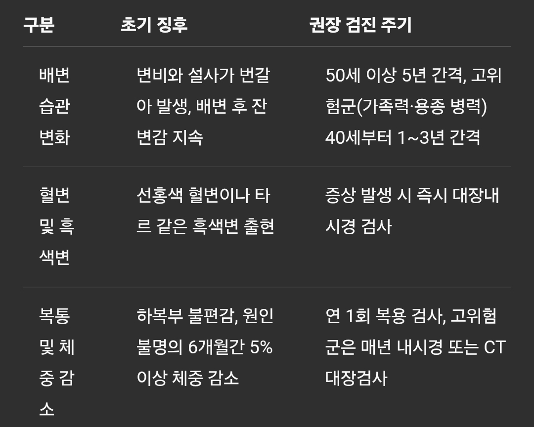 배변 습관 변화 변비와 설사가 번갈아 발생, 배변 후 잔변감 지속 50세 이상 5년 간격, 고위험군(가족력·용종 병력) 40세부터 1~3년 간격