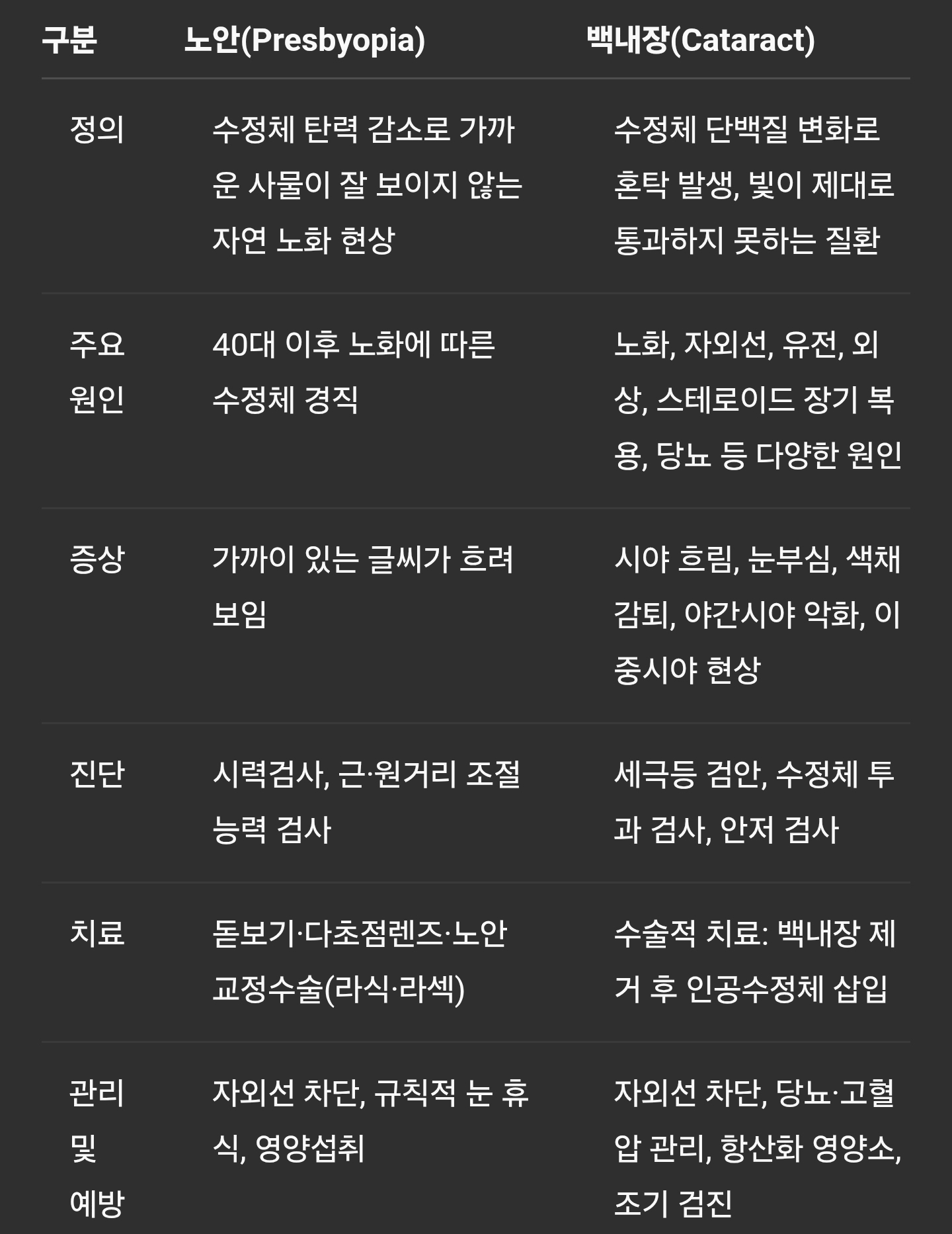 구분 노안(Presbyopia) 백내장(Cataract)