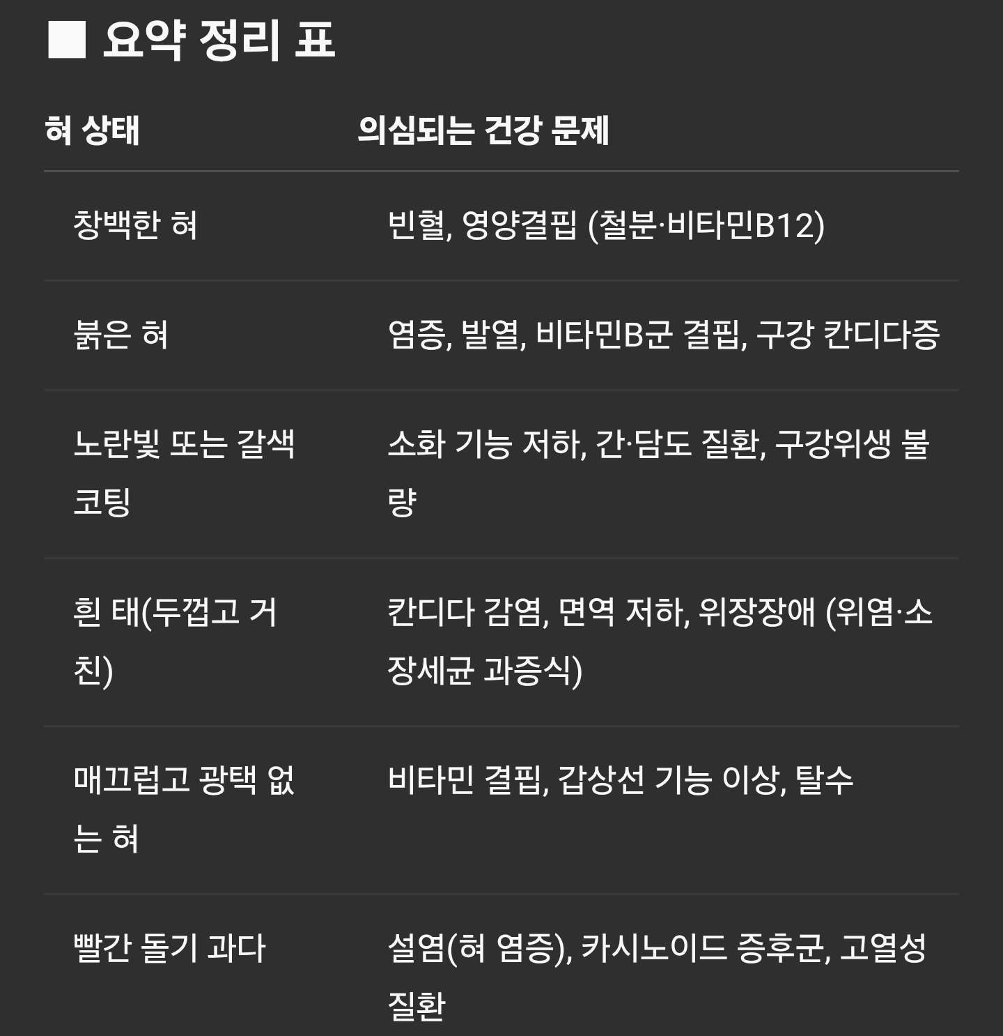 위에서 제시한 혀 상태별 건강 신호와 대응 전략을 참고해 구강 관찰 습관을 기르고, 필요 시 적절한 검사와 치료를 병행하여 건강을 지켜 나가시기 바랍니다.