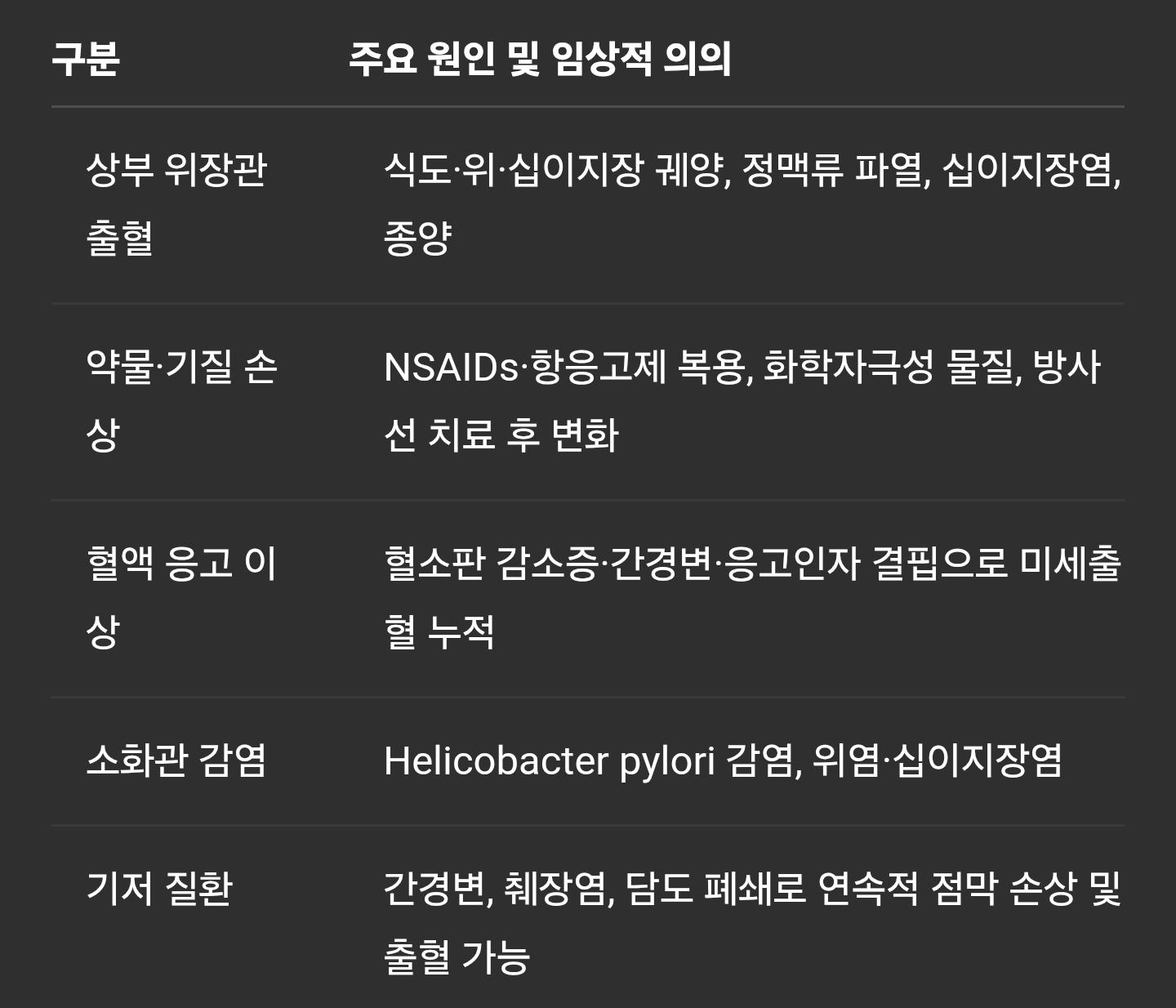 상부 위장관 출혈 식도·위·십이지장 궤양, 정맥류 파열, 십이지장염, 종양