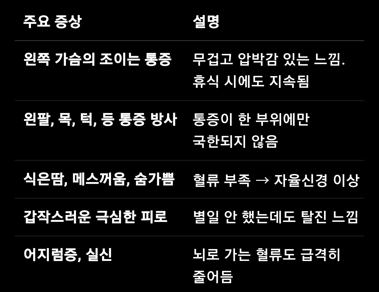 특히 왼쪽 가슴 통증, 숨이 차고 식은땀, 갑자기 오는 피로감…