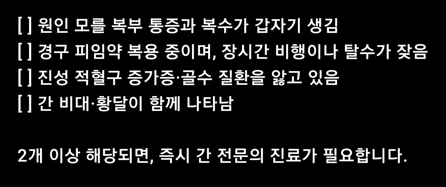 [ ] 원인 모를 복부 통증과 복수가 갑자기 생김