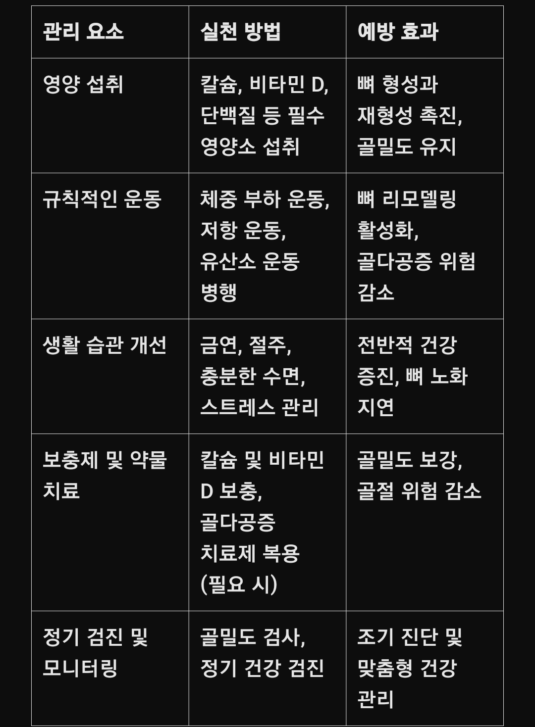 Ⅷ. 간단한 표: 뼈 건강 관리 전략 요약