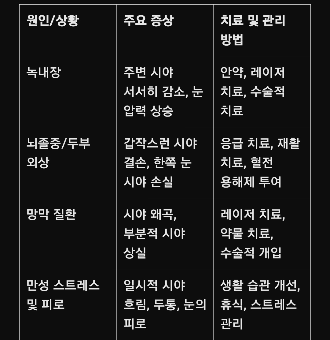 안과적 원인(녹내장, 망막 질환)부터 신경학적 요인(뇌졸중, 두부 외상)까지
