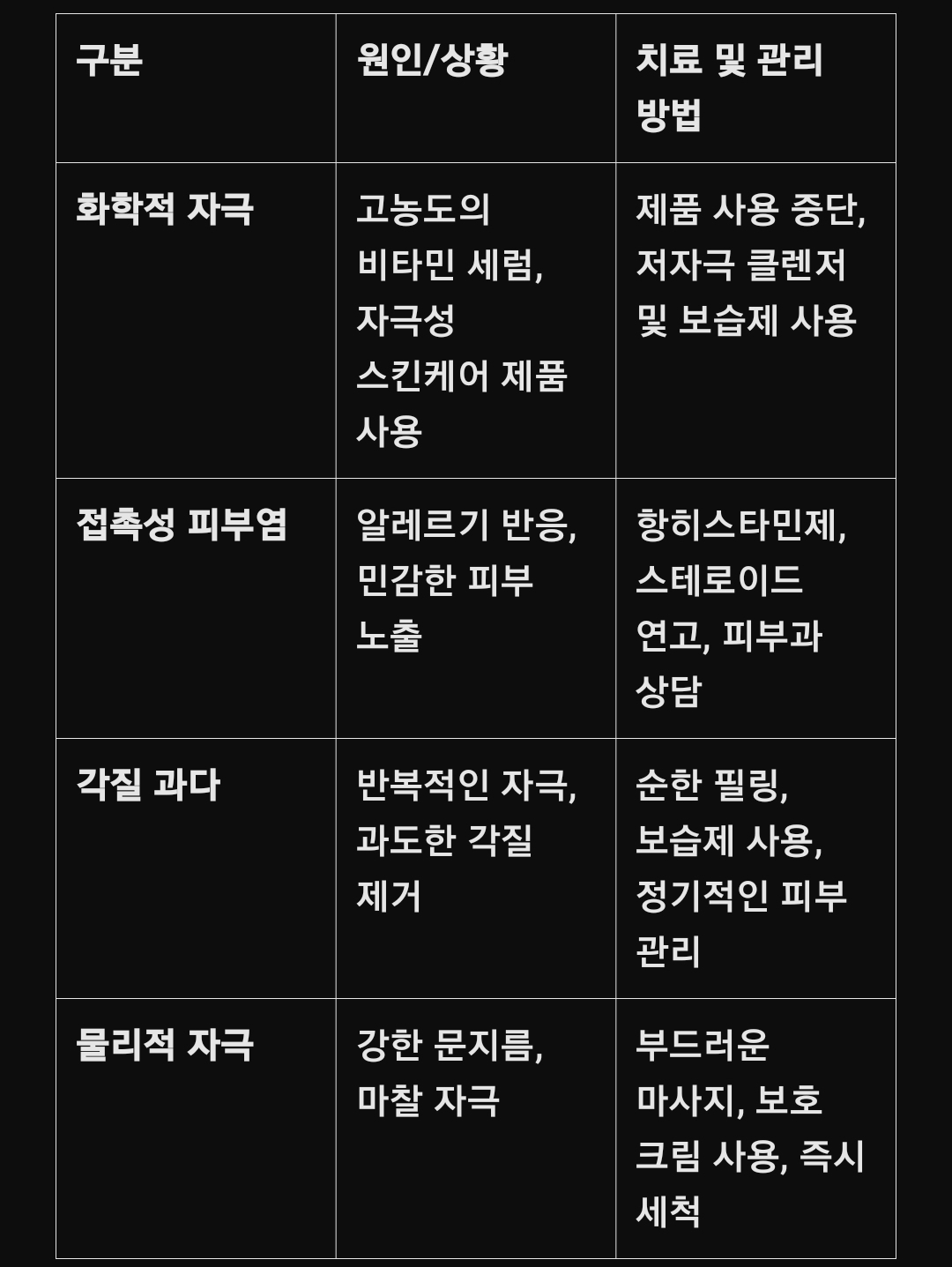 과도한 물리적 자극, 개인의 피부 민감도 등 다양한 요인에 의해 발생할 수 있습니다.