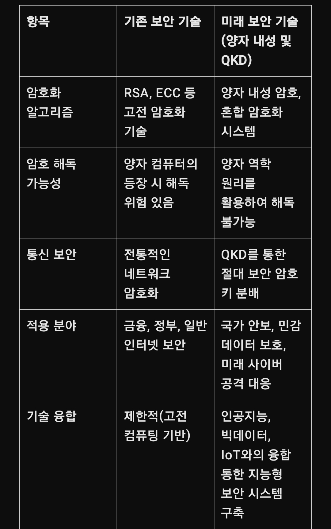 아래 표는 양자 컴퓨팅 기술 발전에 따른 기존 보안 기술과 미래 보안 기술의 주요 특징을 요약한 것입니다.
