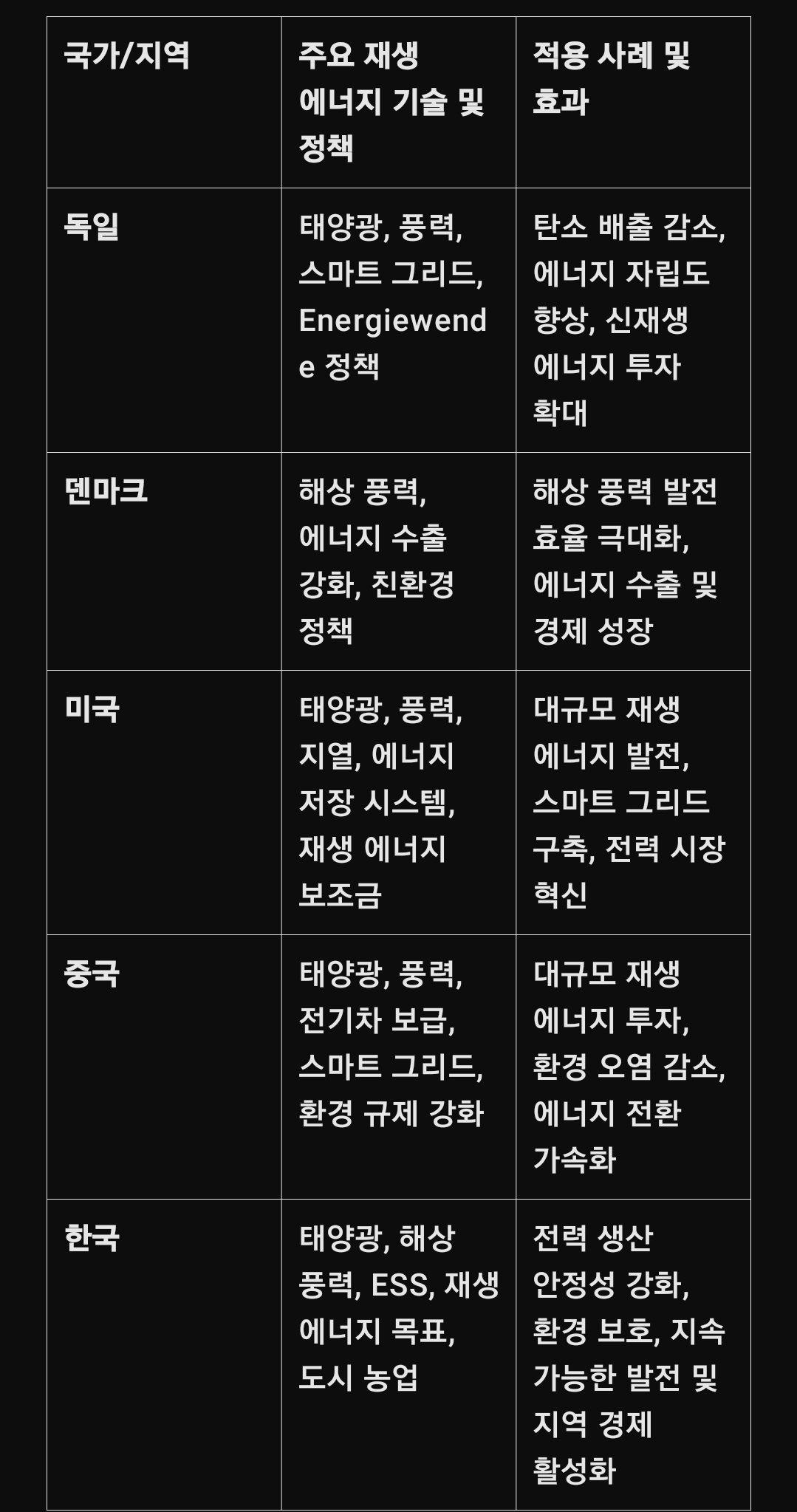 아래 표는 주요 국가 및 지역에서 추진 중인 재생 에너지 기술과 에너지 전환 정책, 그리고 그 효과를 요약한 것이다.