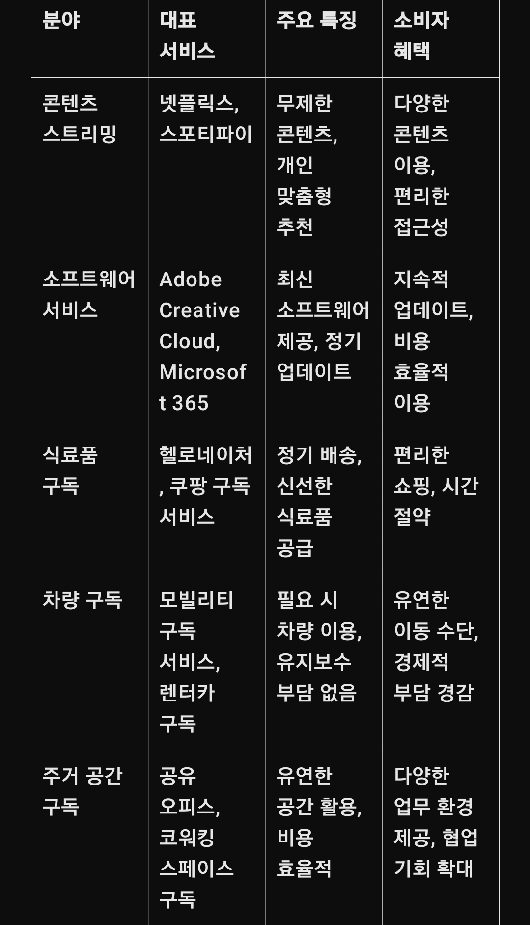 간단한 표: 구독 경제의 대표 분야와 주요 특징