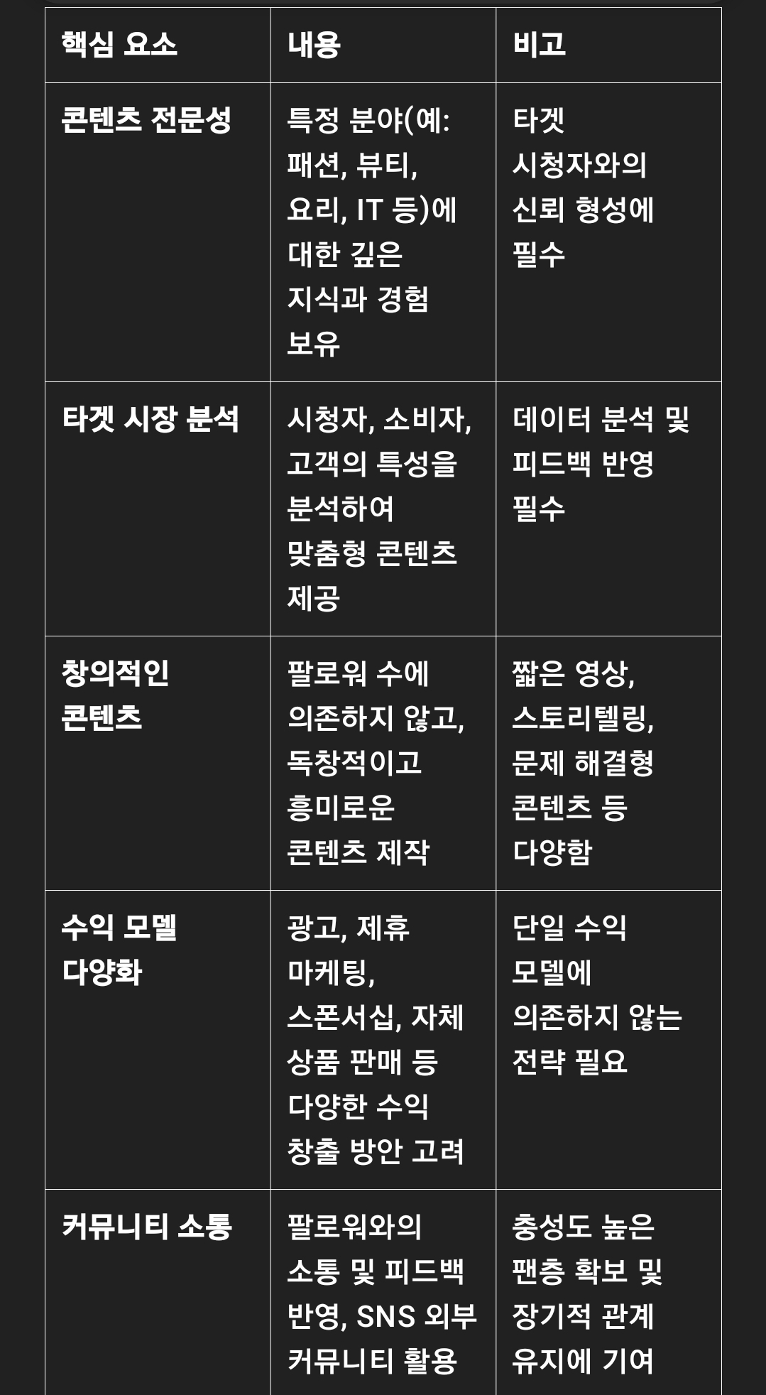 아래 표는 SNS 인플루언서 마케팅에서 고려해야 할 핵심 요소들을 요약한 것입니다.