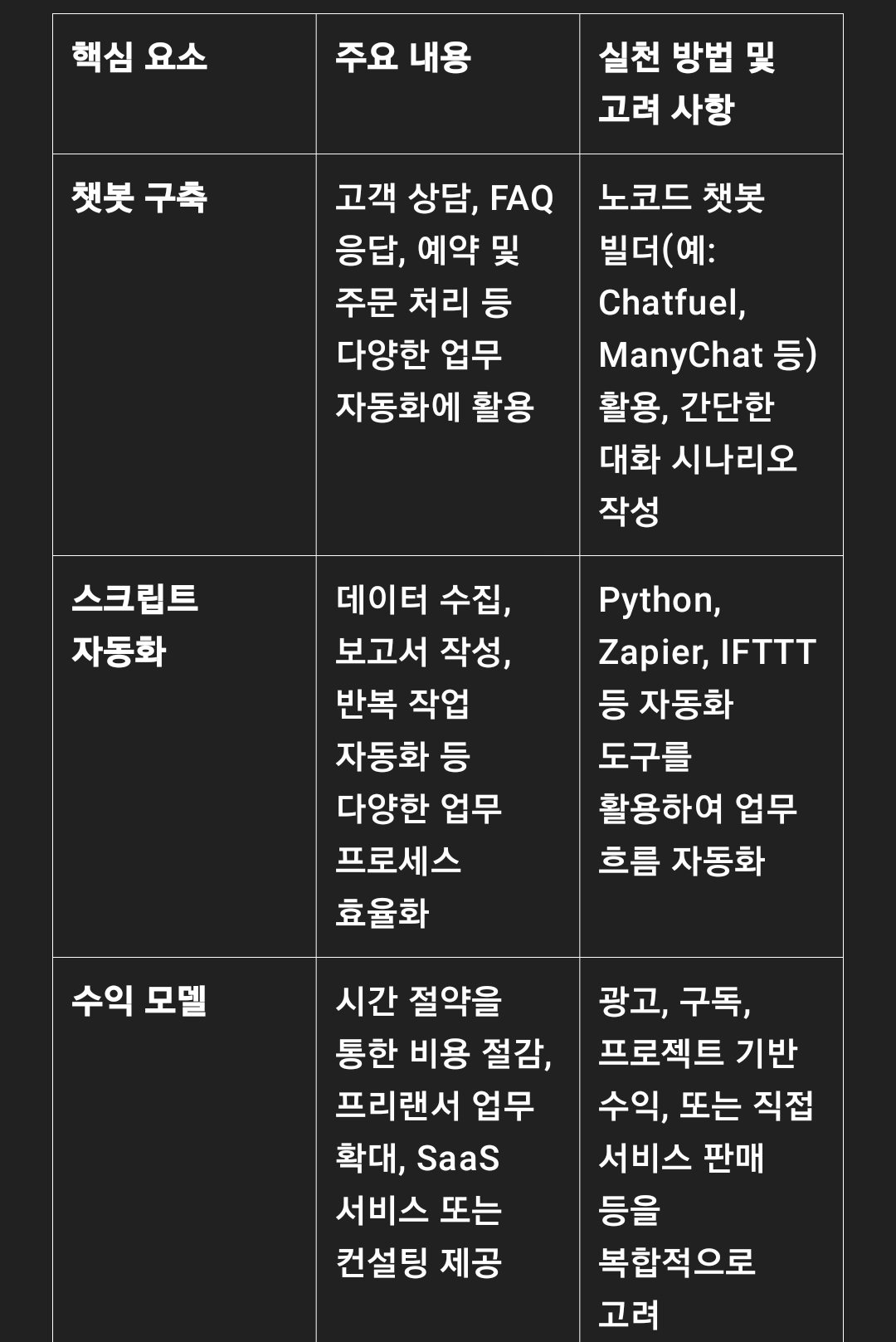챗봇은 고객 상담, 예약, 주문 처리 등 다양한 업무를 24시간 자동으로 처리할 수 있는 도구로, 이를 통해 인건비와 운영 비용을 크게 줄일 수 있습니다. 스크립트 자동화는 데이터를 수집, 처리, 보고하는 등 반복 작업을 자동으로 수행함으로써 업무 효율성을 높이는 역할을 합니다. 이와 같이 AI 기반 자동화는 비즈니스 운영의 여러 부분에서 혁신을 가져오며, 부업으로서의 가능성도 무궁무진합니다.