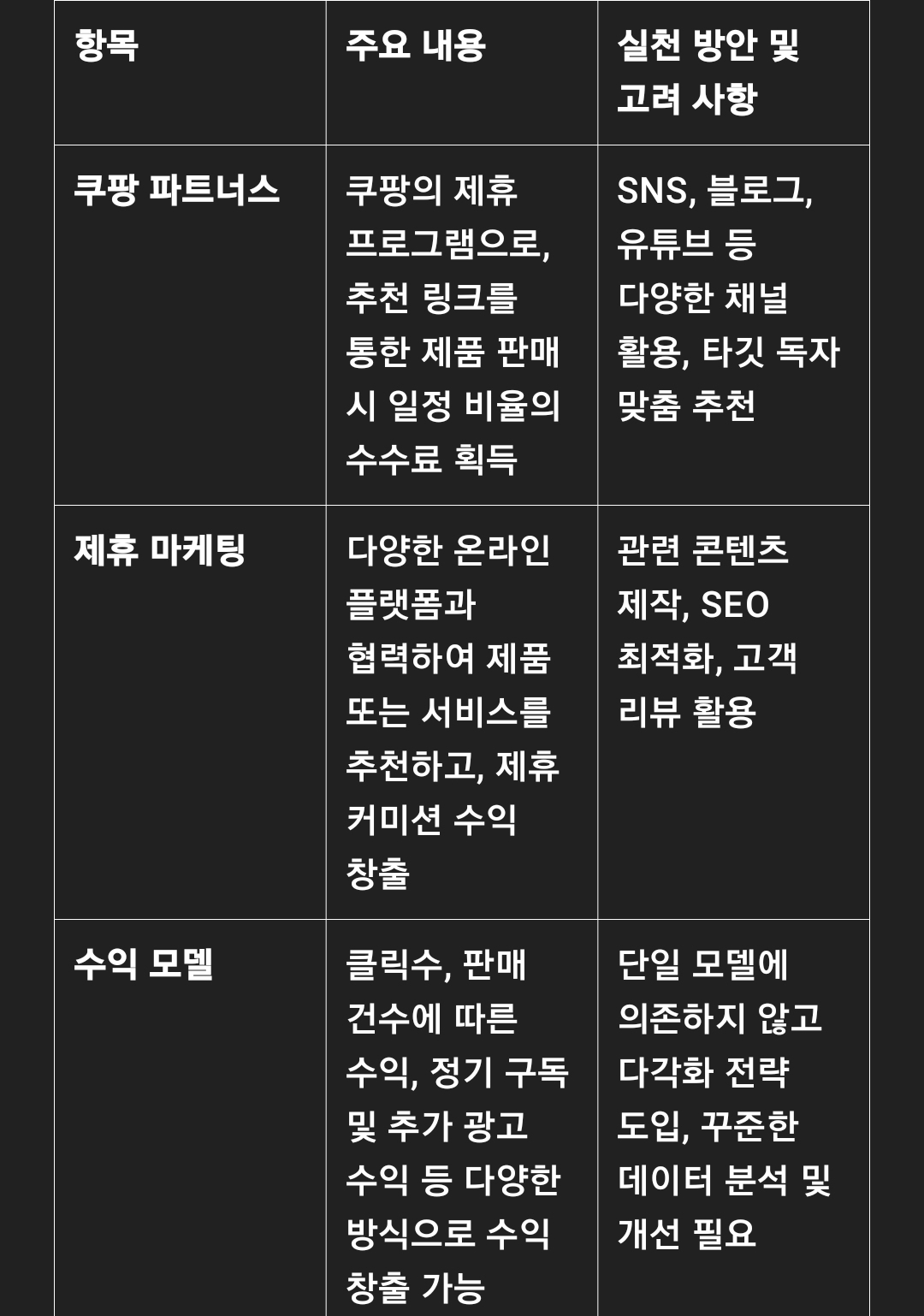 이러한 수익 모델과 운영 전략을 체계적으로 실행하면, 쿠팡 파트너스와 제휴 마케팅을 통한 수익 창출이 더욱 안정적으로 이루어질 수 있습니다.