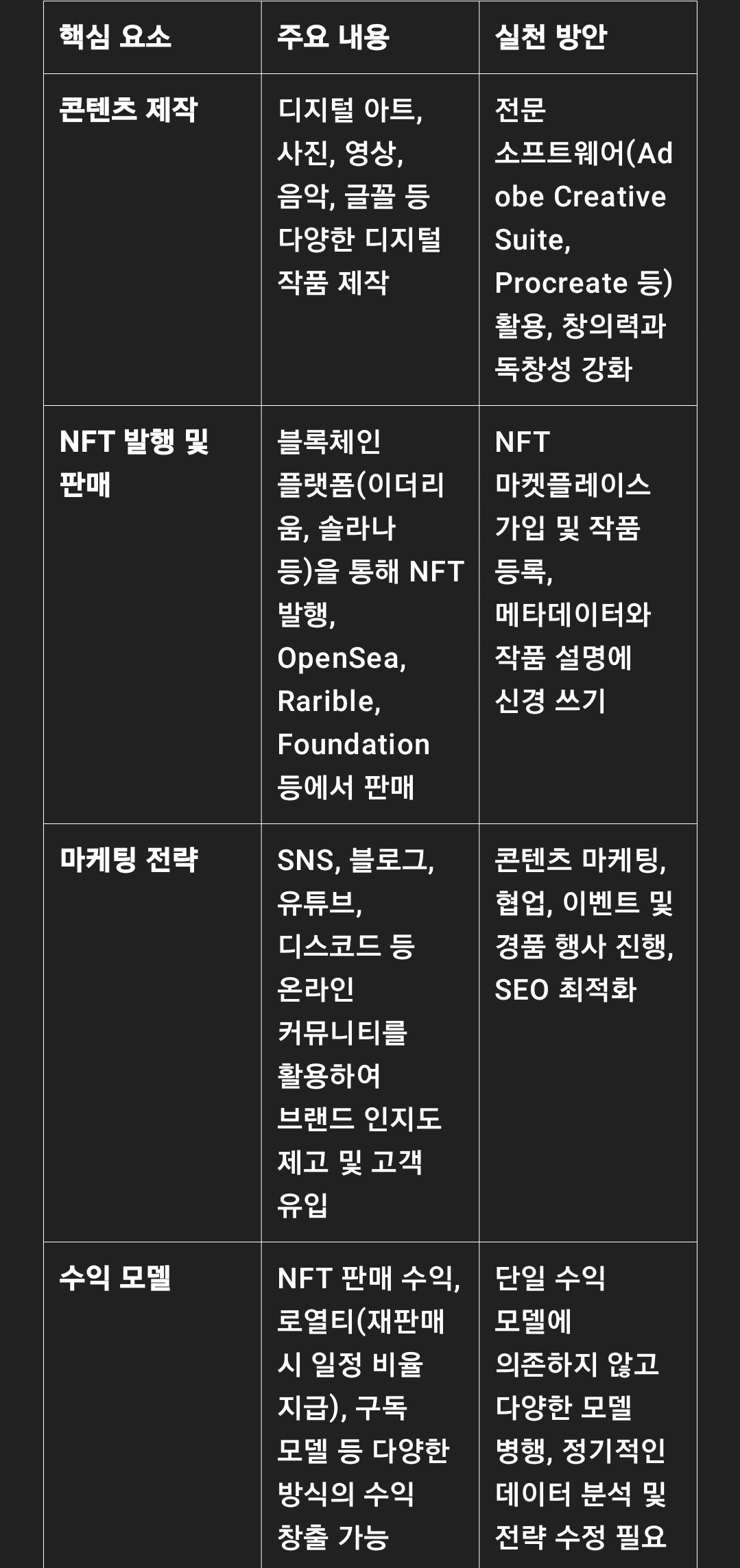 이와 같이 체계적인 준비 과정을 통해 고품질의 디지털 작품을 NFT로 발행하고, 전 세계 고객에게 효과적으로 판매할 수 있습니다.