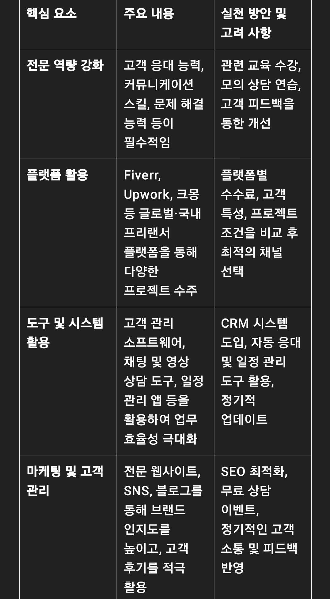 실무 경험: 초기에는 소규모 프로젝트나 무료 상담을 통해 경험을 쌓고, 고객의 긍정적인 후기를 확보하여 신뢰도를 높입니다.