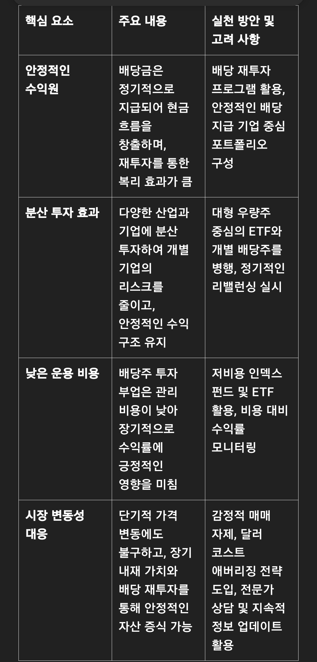배당금의 역할: 배당금은 기업의 안정성과 수익성을 반영하는 지표로, 정기적인 배당금 지급은 투자자에게 꾸준한 현금 흐름을 제공합니다.