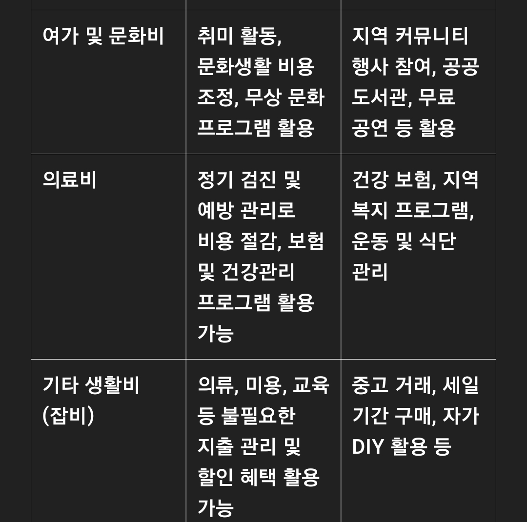 각 영역에서 체계적인 예산 계획과 소비 습관 개선, 정부 지원 프로그램 활용 등을 통해 비용 부담을 효과적으로 줄일 수 있습니다.