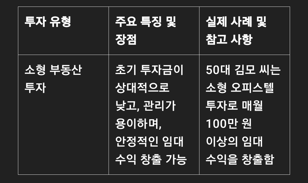 부동산 투자는 일반적으로 초기 투자금이 많이 들고, 관리가 복잡하다는 인식이 있지만, 소형 부동산은 상대적으로 투자금이 낮고 관리가 간편한 장점이 있어, 부동산 투자에 처음 도전하는 분들이나 은퇴 후 안정적인 소득을 원하는 분들에게 매우 매력적인 선택지가 될 수 있습니다.