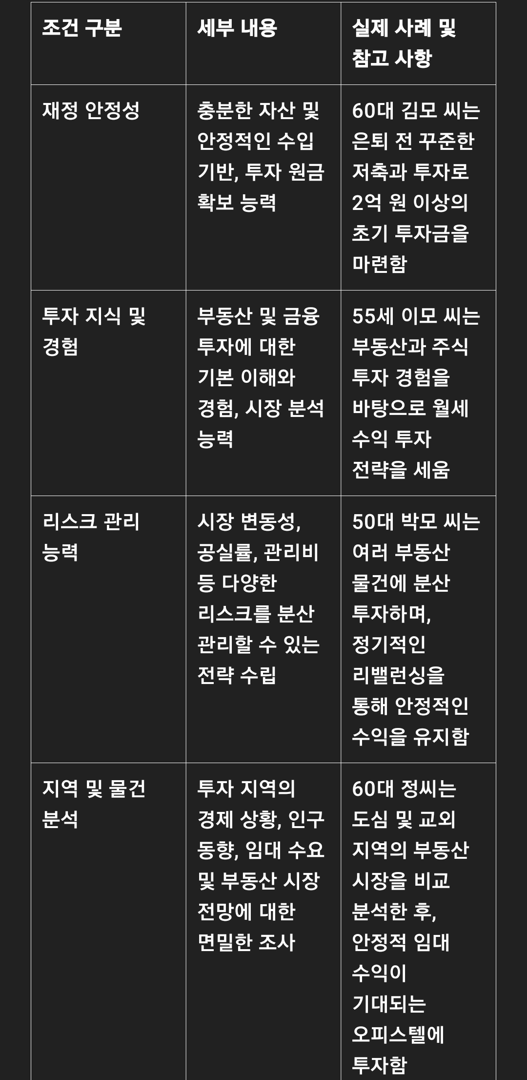 노후 준비를 위한 부동산 투자는 매입에 그치지 않고, 지속적인 관리와 장기적인 계획이 필요합니다.