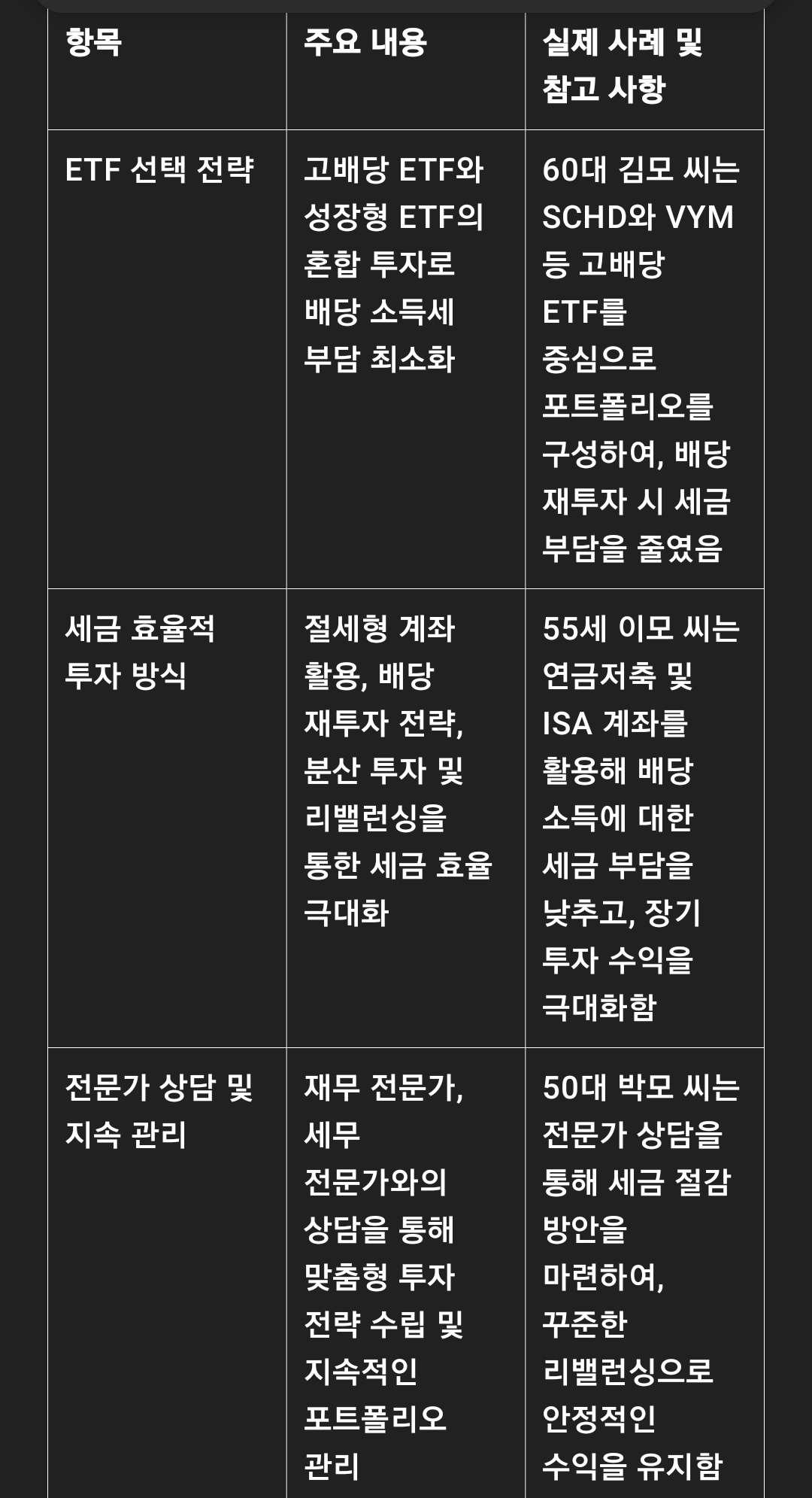 60대 김 모 씨는 SCHD, VYM 등 고배당 ETF에 집중 투자하여 매월 일정한 배당 수익을 확보하였습니다.