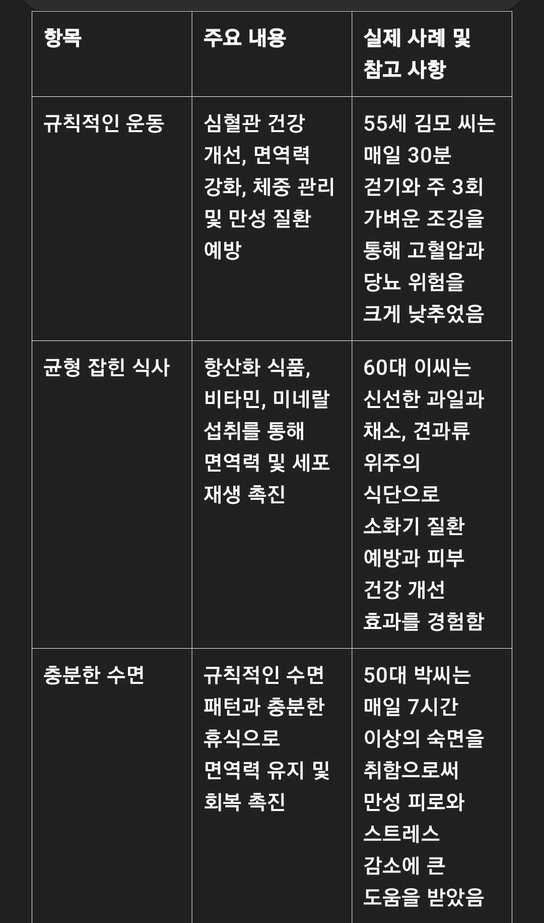 운동의 중요성: 규칙적인 운동은 체중 관리, 심혈관 건강, 면역력 강화에 매우 효과적입니다.