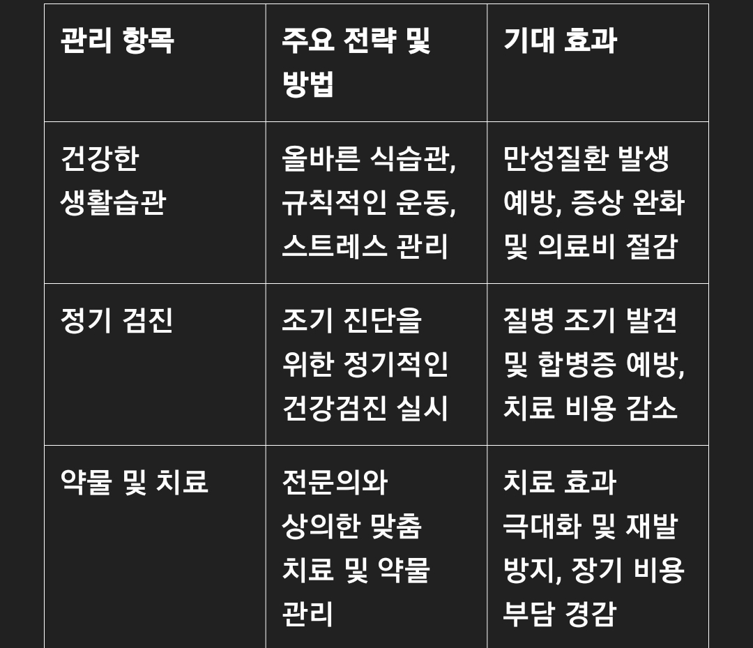 이와 같이, 만성질환의 체계적인 관리는 단순한 비용 절감을 넘어 삶의 질 향상과 보다 건강한 사회를 이루는 데 중요한 열쇠가 됩니다. 꾸준한 자기 관리와 전문가의 조언을 통해 매일의 작은 변화가 장기적으로 큰 긍정적 효과를 가져올 것임을 기억해 주시기 바랍니다.