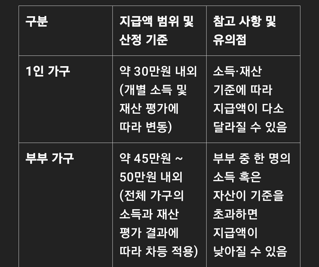 국민연금 등 다른 소득원이 포함되어 평가되며, 이로 인해 부부 가구의 경우 지급액은 평균적으로 약 45만원에서 50만원 내외로 산정되는 경우가 많습니다.