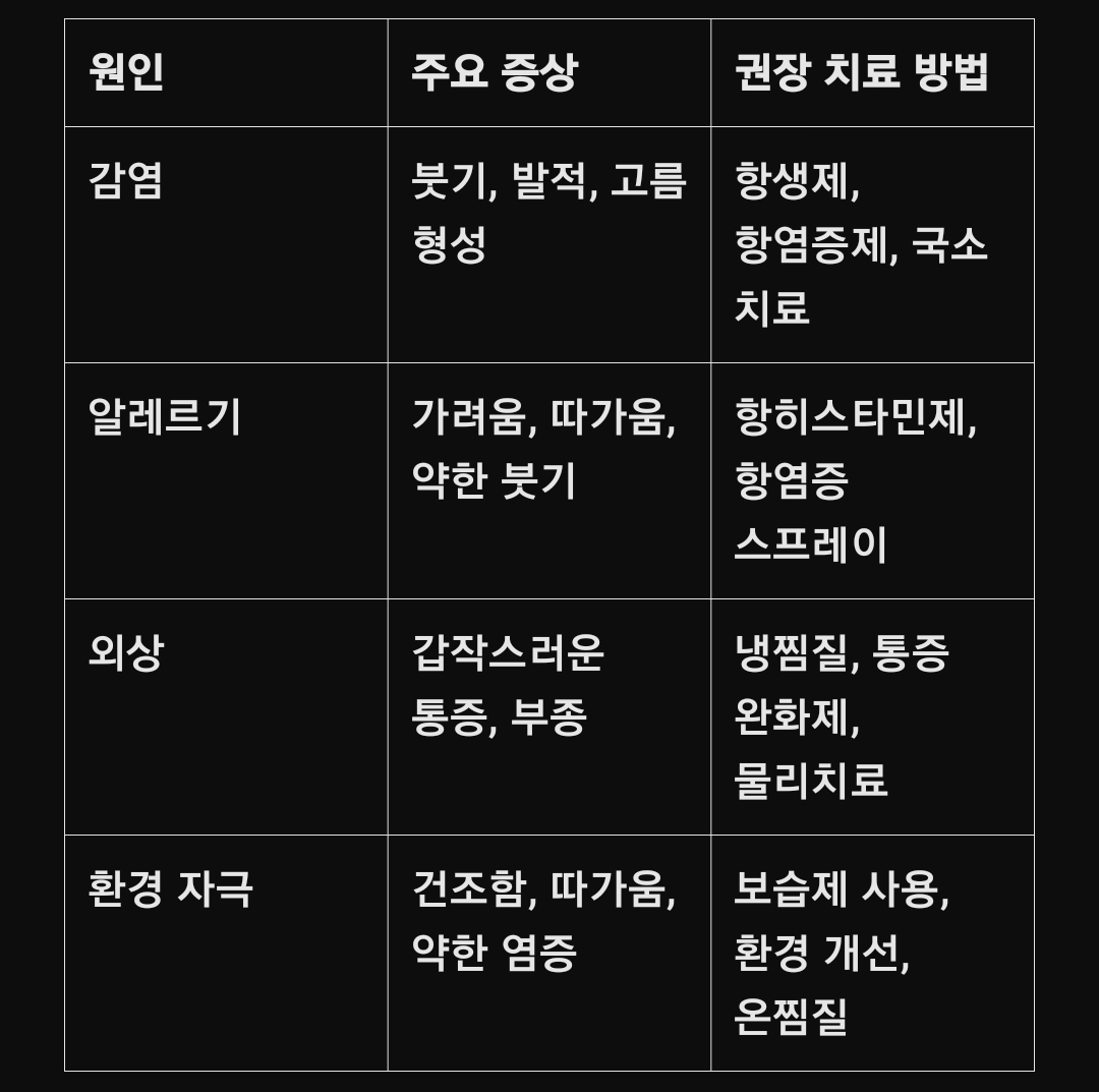 이러한 증상은 감염, 알레르기 반응, 외상 등 다양한 원인으로 발생할 수 있습니다.