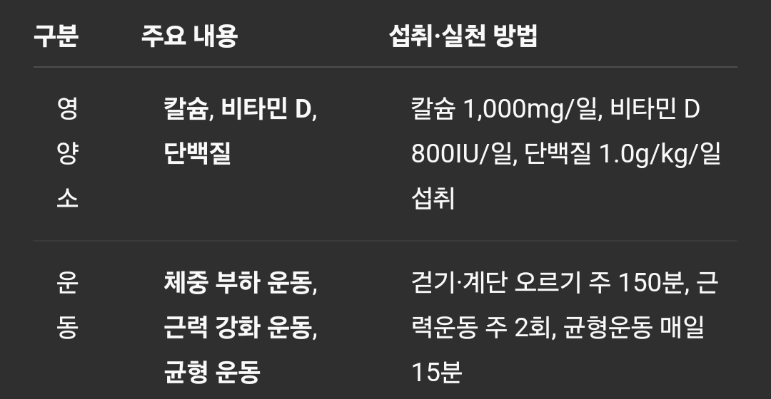 골다공증 예방은 영양소 섭취와 운동을 함께 실천할 때 효과를 발휘합니다. 오늘부터 칼슘·비타민 D·단백질을 충분히 섭취하고, 체중 부하·근력·균형 운동을 꾸준히 실시해 건강한 뼈와 활기찬 삶을 유지하세요.