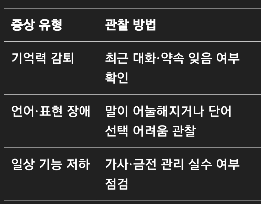 언어·표현 장애 말이 어눌해지거나 단어 선택 어려움 관찰 인지훈련·의료 상담 필요