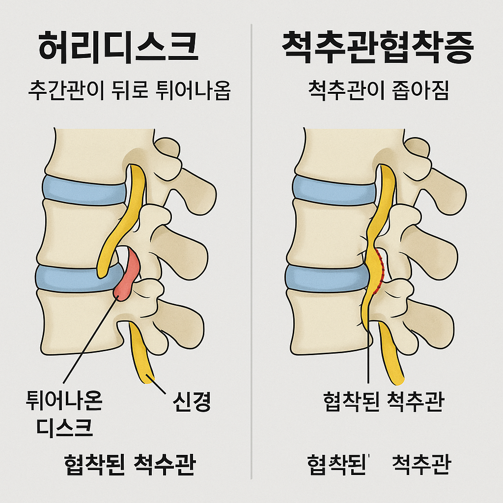 허리디스크와 척추관협착증은 모두 허리 통증을 유발하는 흔한 척추 질환이지만, 발생 기전과 증상, 진단 및 치료법이 다릅니다. 허리디스크는 추간판 내부 수핵의 탈출로 신경근을 압박해 방사통이 주 증상이며, 주로 갑작스러운 통증이 특징입니다. 반면, 척추관협착증은 퇴행성 변화로 척추관 내 신경을 압박해 보행 시 통증과 저림이 반복되는 ‘신경성 간헐적 파행’이 대표 증상입니다.