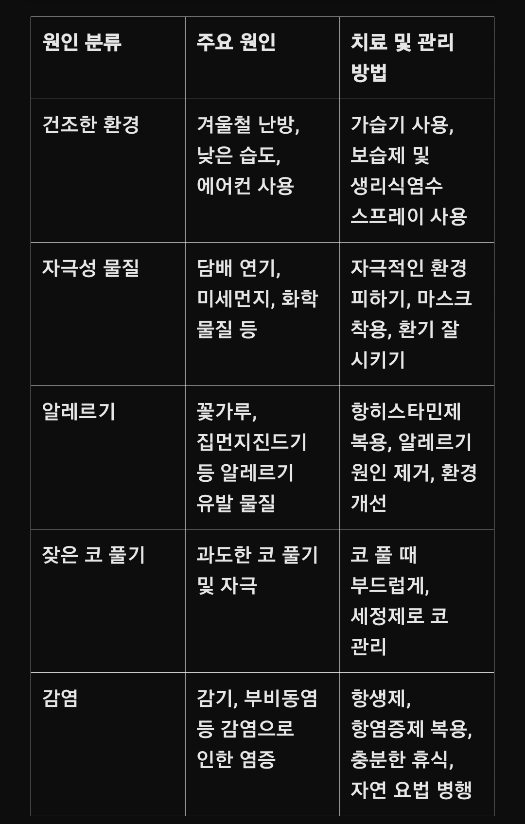 또한, 자극적인 화학 물질, 알레르기, 잦은 코 풀기, 감염, 그리고 환경오염 등도 원인으로 작용할 수 있습니다.