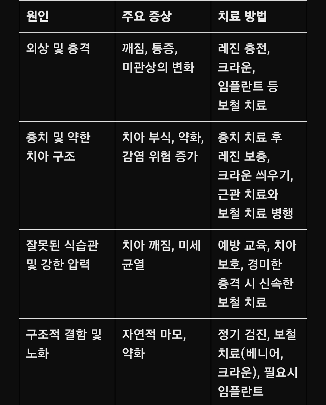 아래 표는 앞니 깨짐의 주요 원인과 각각에 따른 치료 방법을 한눈에 정리한 내용입니다.