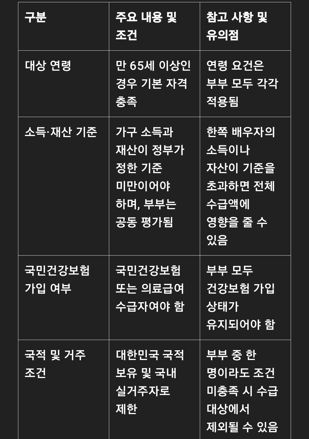65세 이상이면 기초연금의 수급 대상이 되는 기본 연령 조건을 충족하지만, 실제로 부부 모두 기초연금을 받을 수 있는지 여부는 각자의 소득과 재산, 건강보험 가입, 국적 및 거주 조건 등 복합적인 요소에 의해 결정됩니다.